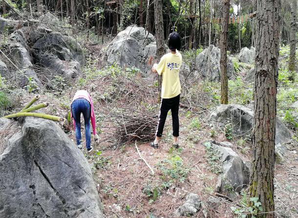 清場(chǎng):場(chǎng)地路面的枯枝與雜草處理。先是樹上的枯藤殘刺,身高不夠,我們就穿上裝備去到平臺(tái)上切割。地上雜草叢生,我們就一棵一棵的連根拔起。然后找來鮮騰捆好,一捆捆的背下山來。排除一切的蛇鼠蟲蟻,為游客的舒心加把安全鎖。