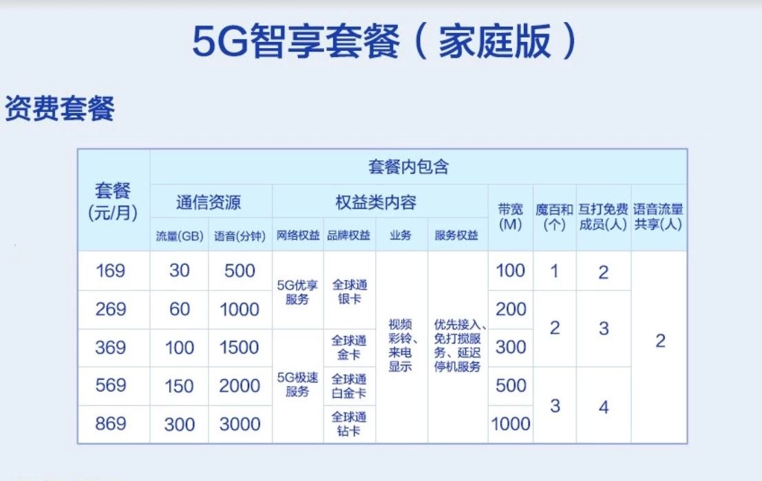 中國移動(dòng)5G套餐家庭版資費(fèi)情況