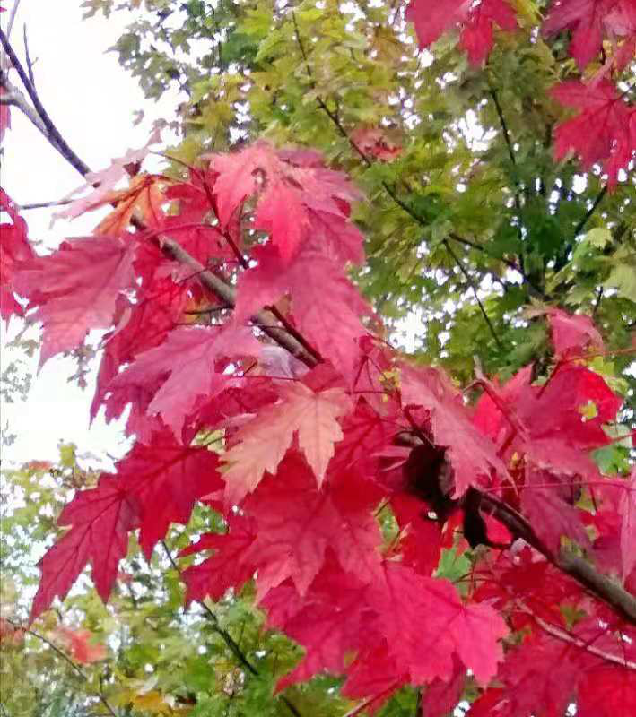 金色的十月,是那秋雁不辭勞苦,不知道是從什么地方,銜來了秋霜,染紅了那漫山遍野的楓葉,紅的是那么的鮮艷,紅的是那么的燦爛。“霜葉紅于二月花”,紅葉嫵媚在厚重的晚秋里,她吟唱著,她飛舞著,她漫撒在通幽的曲徑處,她飄舞在斜陽古道上,她點綴在蔥綠的松林下 。她舞在相思的十月,看!漫山紅透,層林盡染。那是楓的情懷,那是楓的憐愛。那是楓的訴說,那是楓的精采。