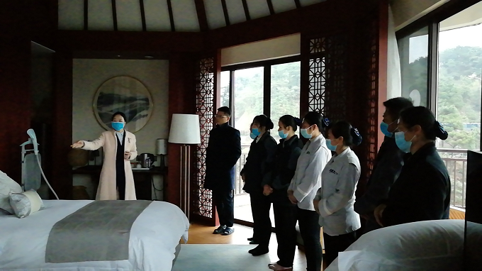 客房部正在培訓如何布置房間,如何鋪床等